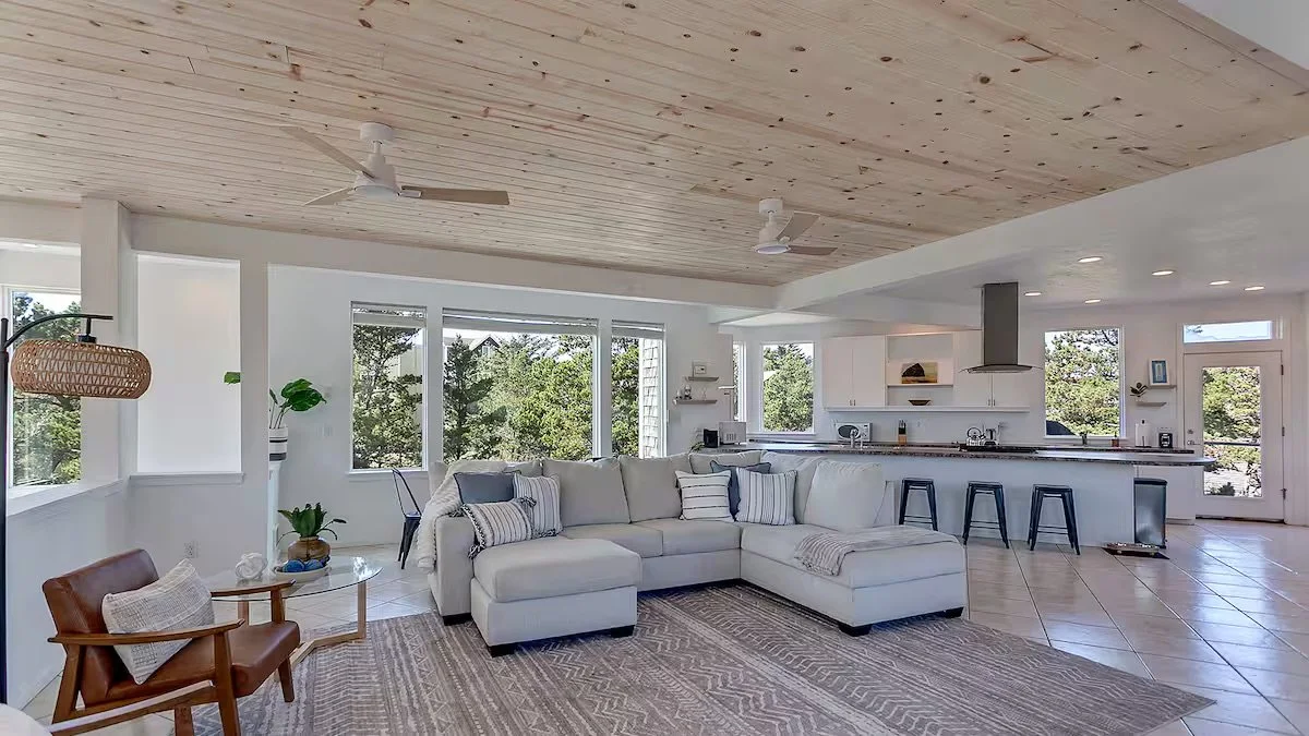 We’ll settle into a beautiful, spacious coastal home that sleeps 13 guests. The property includes two king bedrooms and two rooms each featuring a queen bed plus two bunks, with 3.5 shared bathrooms throughout the house.